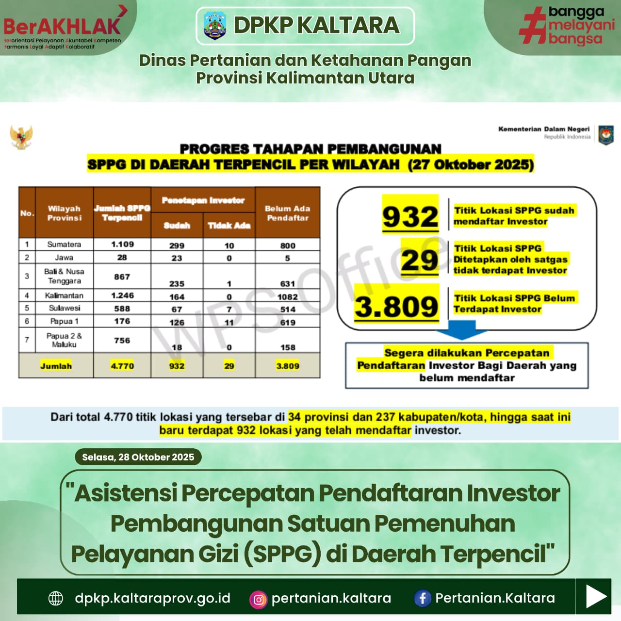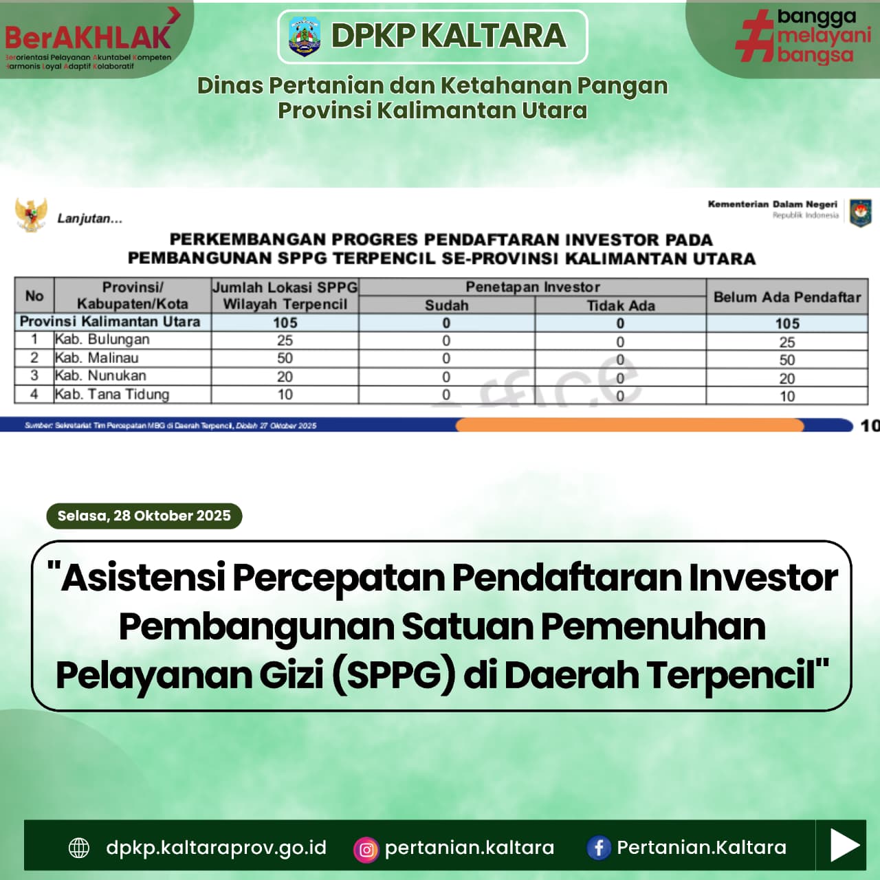 Bertempat di ruang Rapat Benuanta Gedung Gadis II Lantai I, Selasa, 28 Oktober 2025 — Dalam upaya mempercepat pembangunan fasilitas pelayanan gizi di wilayah terpencil, Kementerian dalam Negeri dan Pemerintah Provinsi Kalimantan Utara menyelenggarakan kegiatan asistensi pendaftaran investor untuk pembangunan Satuan Pemenuhan Pelayanan Gizi (SPPG) di wilayah 3T.