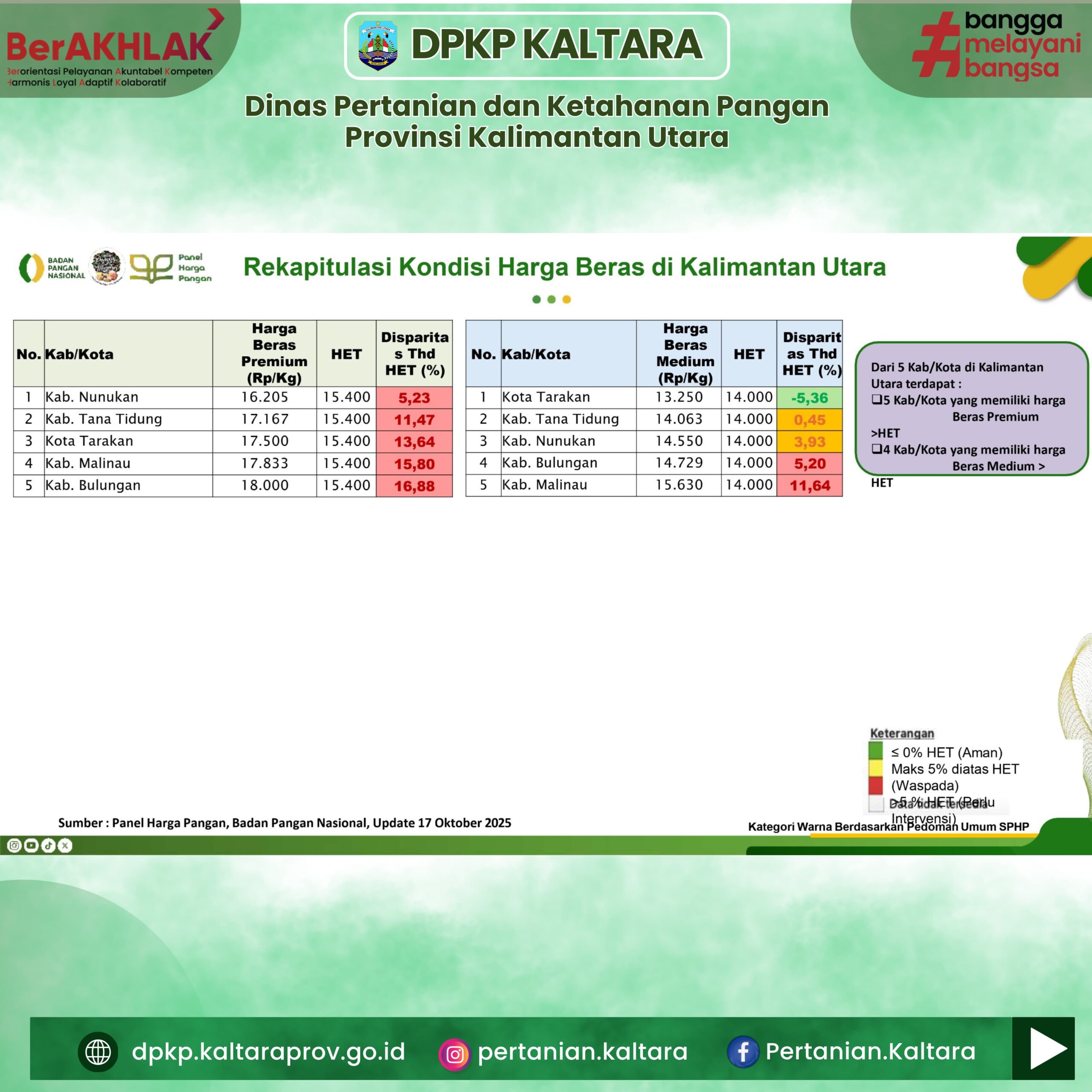 Pemerintah melalui Badan Pangan Nasional menggelar Rapat Koordinasi bersama Tim Satgas Pangan Pusat dalam rangka memperkuat kegiatan pengawasan dan pengendalian harga beras di seluruh wilayah Kaltara. Rapat ini dipimpin oleh Bambang Hariyanto selaku Ketua Tim Sosialisasi dan KIE Keamanan Pangan Badan Pangan Nasional, Kepala DPKP Ir. Heri Rudiyono, MS. i, dan Kepala Disperindagkop Hj. Hasriyani S.H., MM, dihadiri oleh Krimsus Polda Kaltara, Dinas Kab/Kota Sekaltara yang membidangi, Perum Bulog, Distributor serta perwakilan pemerintah daerah terkait.